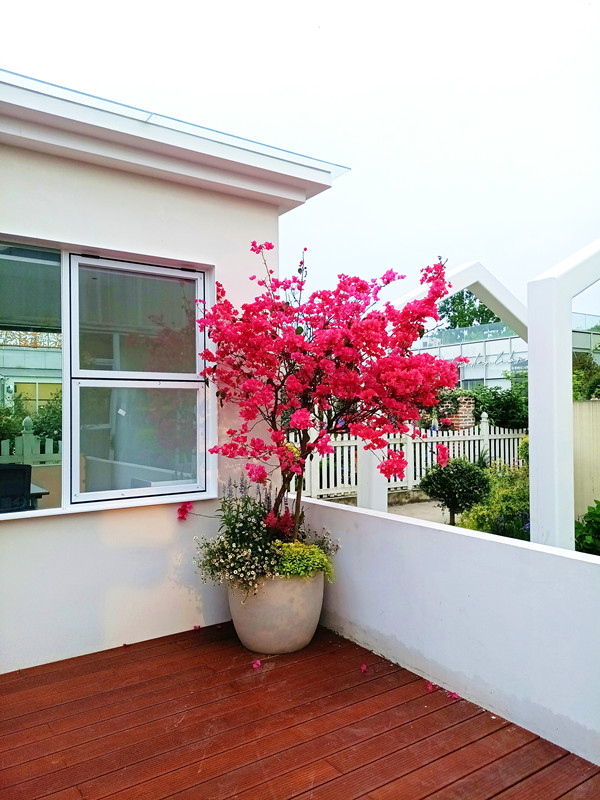 一盆漂亮而碩大的三角梅,像一團燃燒的火焰,在綠色組景與白色房子中,顯得分外耀眼,熱烈喜慶的紅色,預示著花卉事業(yè)的紅紅火火、蓬勃興旺。