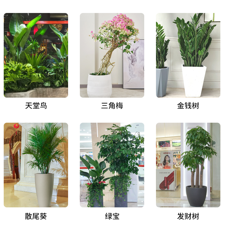 矮寶套餐的適用范圍很廣,幾乎包涵我們常見常用的綠植,如天堂鳥、三角梅、金錢樹、黑金剛、綠寶、發財樹、散尾葵等。