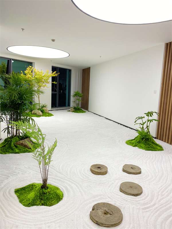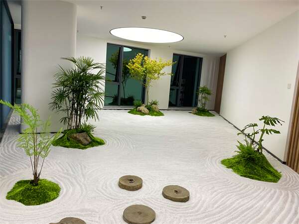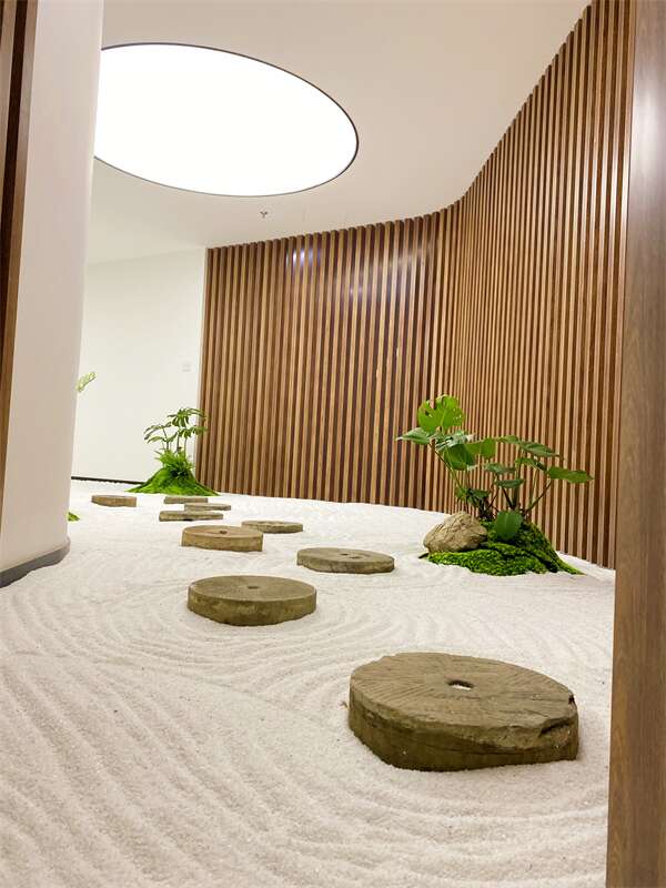 為營(yíng)造自然唯美的山水景觀,用造型奇特、極具藝術(shù)感的景觀石來(lái)體現(xiàn)奇山異峰,用白色鋪面石來(lái)體現(xiàn)江河湖泊,細(xì)紋淺顯的水紋、曲折蜿蜒的汀步石,共同形成山水交融、人景合一的逼真效果,讓人漫步其中,瞬間就有一種回歸自然、心舒神朗的感覺,讓人在緊張繁忙的辦公場(chǎng)所,足不出戶,也能享受這種唯美天然、綠色生態(tài)的治愈系風(fēng)景。
