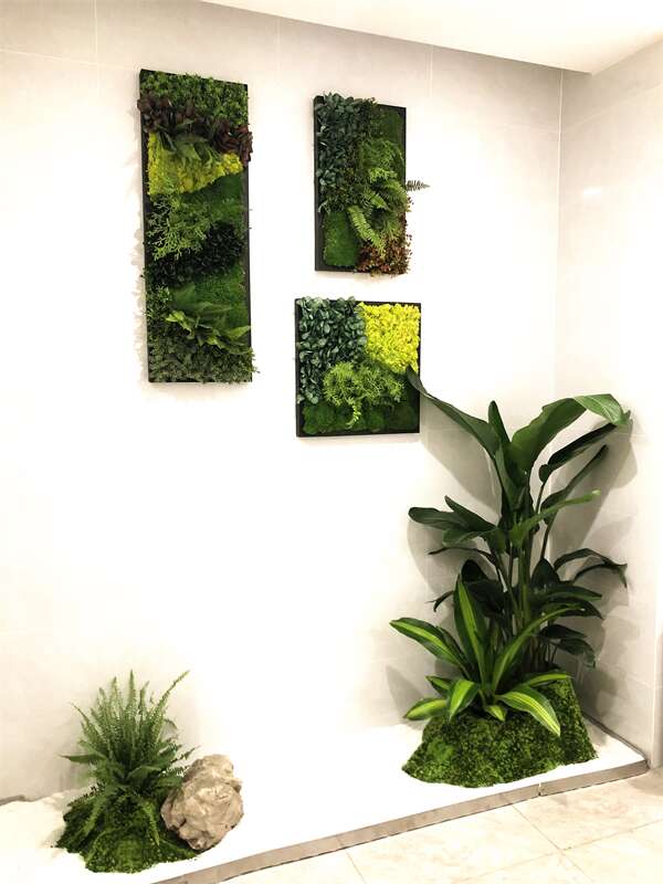 墻上設(shè)計(jì)一組大小不一的植物畫框,就像一幅濃縮版的風(fēng)景圖案,呼應(yīng)了地面的綠植組景。組景用水紋加山石、青苔進(jìn)行組合,水紋流動(dòng),青苔起伏,形成一種山水交融的景觀效果。兩側(cè)的盆栽巧妙融入其中,拉近了綠色辦公與大自然的距離,抬眼即見的是綠色,觸手可及的是風(fēng)景。