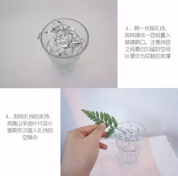 如果不用葉子,全部用小雛菊插制,可以嗎?當然可以,只要掌握好空間疏密;葉片用排草或九里香葉代替、小雛菊用迷你菊或多頭玫瑰,可以嗎?當然可以,不同的花材有其不同的美,只要花兒與瓶器的搭配比例自然即可。