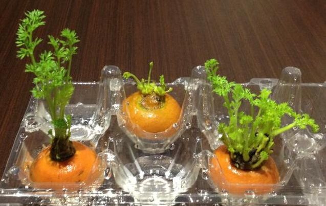 胡蘿卜的蒂需要很久才會(huì)生根、發(fā)芽,但發(fā)芽以后的生長(zhǎng)速度很快。它們會(huì)先長(zhǎng)出莖,直到莖長(zhǎng)得很高才會(huì)慢慢抽出新芽,長(zhǎng)出枝葉。