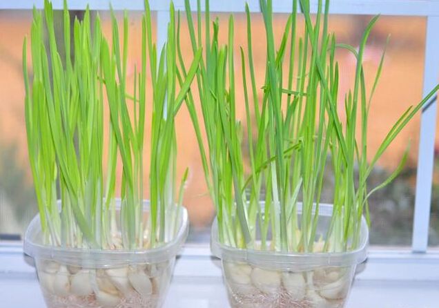 將大蒜放入容器,只須倒入少許水,淹沒(méi)蒜根部,一段時(shí)間過(guò)后,就能長(zhǎng)出繁茂青翠的蒜苗了。