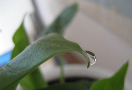 滴水觀音為熱帶和亞熱帶常見觀賞植物,當在空氣溫暖潮濕、土壤水分充足的條件下,便會從葉尖端或葉邊緣向下滴水。看到這里花友有沒有看出幾個滴水觀音滴水的要點,空氣溫暖、潮濕、土壤水分充足,我們可以認為滴水觀音之所以滴水是在自我調節。