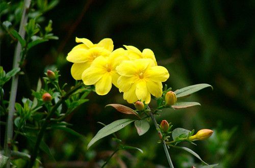 迎春花屬落葉灌木叢生。小枝細長直立或拱形下垂,呈紛披狀。3小葉復(fù)葉交互對生,葉卵形至矩圓形。花單生在去年生的枝條上,先于葉開放,有清香,金黃色,外染紅暈,花期2-4月。因其在百花之中開花最早,花后即迎來百花齊放的春天而得名。