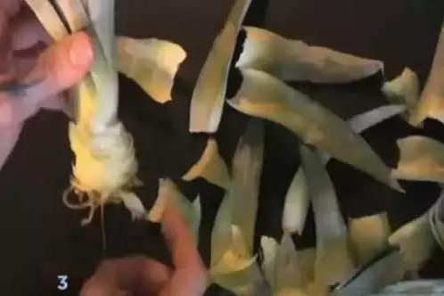 第三步:從下部綠色小葉起逐層剝離外部的綠色葉子,根據葉叢大小留5-10片大葉。注意只剝離外面的綠色葉子。在綠葉之間可能會隱藏著一些小葉子,這些葉子予以保留。這樣下部就有1.5厘米到2.5厘米的白色莖部暴露出來了。