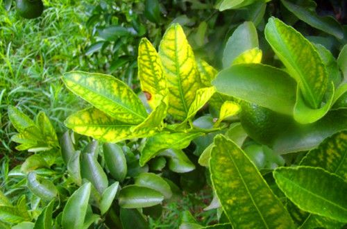 2、缺鐵:一般嫩梢先表現癥狀,葉片變薄黃化,淡綠至黃白色,葉脈綠色,在黃化葉片上呈明顯的綠色網紋,以小枝頂端的葉片更為明顯。病株枝條纖弱,幼枝上葉片很易脫落,常僅存稀疏的葉片。小枝葉片脫落后,下部較大的枝上才長出正常的枝葉,但頂枝陸續死亡。發病嚴重時全株葉片均變為橙黃色。