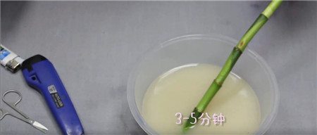 第二步:處理莖端,把莖端斜切之前,先用打火機烤一下刀片進行消毒,切口呈馬蹄狀,可以增加切口與水的接觸面積,利于吸收水分。