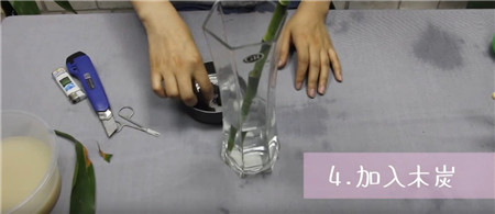 第四步:在水培容器中加入1/3的水即可,水太多容易導致富貴竹爛根。可以在水中放入木炭,可起到消菌殺毒作用,防止爛根。
