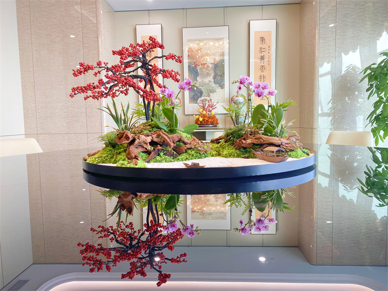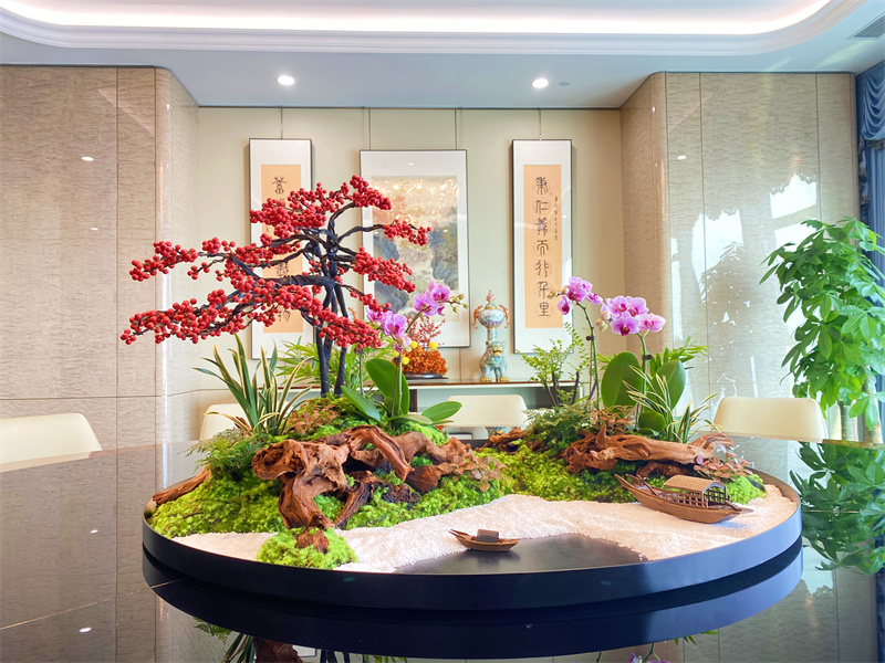 桌景創(chuàng)意來源杜甫的兩句名詩“曉看紅濕處、花重錦官城”“窗含西嶺千秋雪、門泊東吳萬里船”。