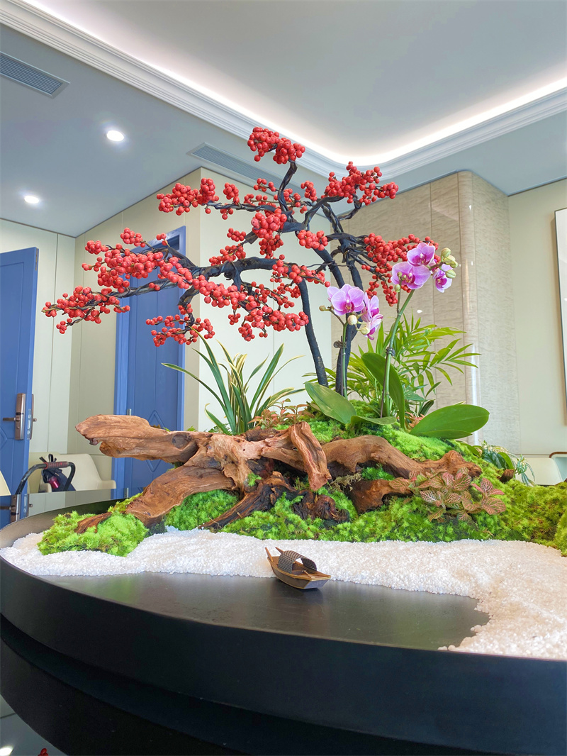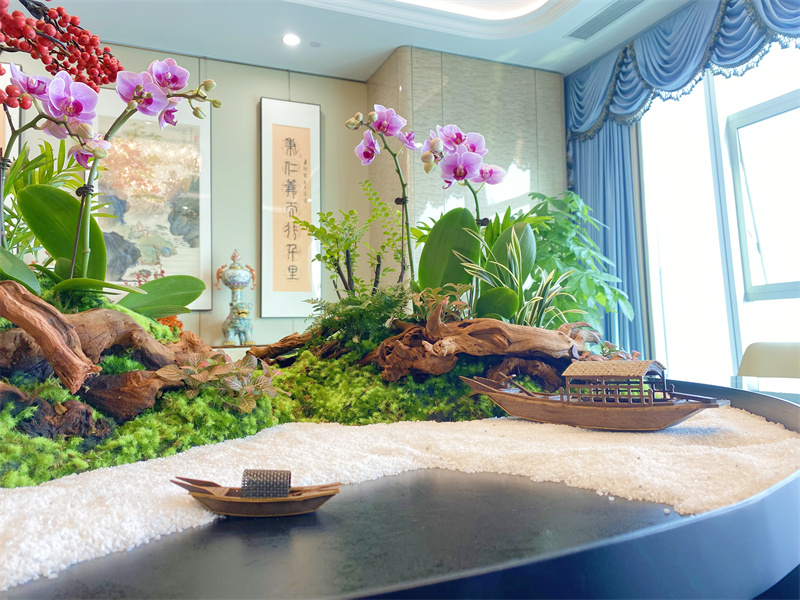 【形】以北美冬青、蝴蝶蘭為主要花景,配上綠植搭配,呈現(xiàn)一個川西園林的景觀,白色的沙石,則代表家喻戶曉的錦江,兩三只小船,則代表錦江上歷史悠久的東門碼頭。