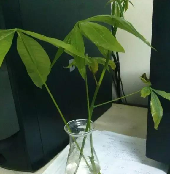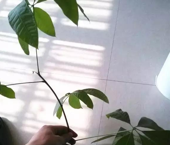 用小刀截取發(fā)財(cái)樹(shù)半木質(zhì)化枝條,10-15厘米左右,切口成馬蹄狀,光滑無(wú)損傷,留下2-3個(gè)葉片,其余摘掉。