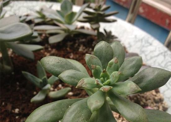 2、病蟲害。多肉要是被害蟲爬過或咬過,很多也會起斑,所以我們可以觀察尋找害蟲,用鑷子處理它們!如果找不到或者是蚜蟲介殼蟲,建議用藥物處理。